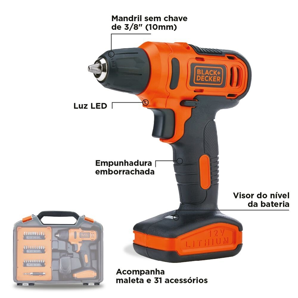 Kit Parafusadeira Furadeira 3/8" 12V Íon de Lítio 31 Acessórios LD12SC-BR