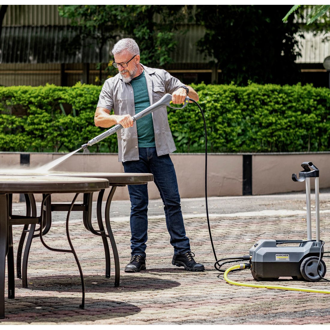 A lavadora de alta pressão profissional leve Kärcher modelo HD 585 Prof dispões de uma vazão de 500 l/h com pressão de até 110 bar. Possui design compacto e robusto, rodas grandes e baixo centro de gravidade, conferindo excelente mobilidade. Possui tubeira e os três pistões de sua bomba em aço inox o que somados ao seu cabeçote latão proporcionam uma maior resistência e durabilidade à altas pressões. Conta com mangueira reforçada com trama de aço, alça de transporte e espaço para armazenar o cabo elétrico e a mangueira. Possibilidade de sucção de reservatório. Consagrada como líder de mercado.